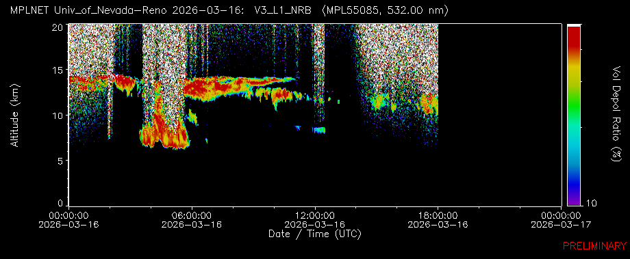 UNR Lidar data shows cloud height and laser pulse for close to 16z. Degree of depolariation related to the shape of aerosols, cloud droplets, and ice crystals.