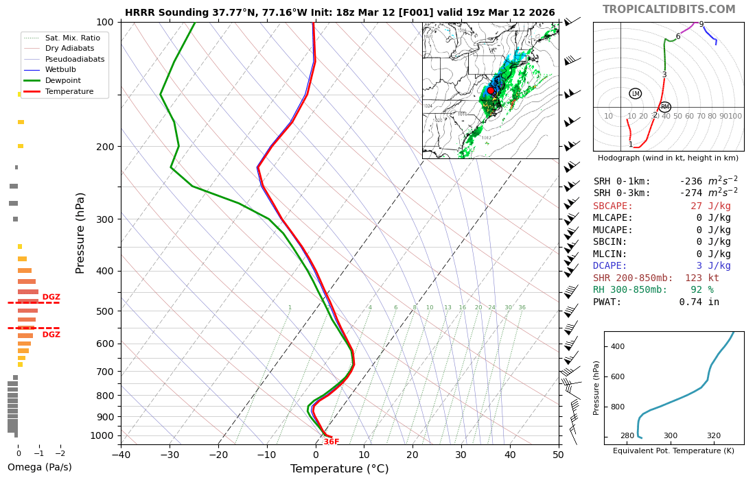 a. High-resolution-model soundings for various locations (example) by clicking at points on the model output. Discuss the usual, in addition to Omega, and DGZ, and the wind shear from near the surface to 500 mb.
