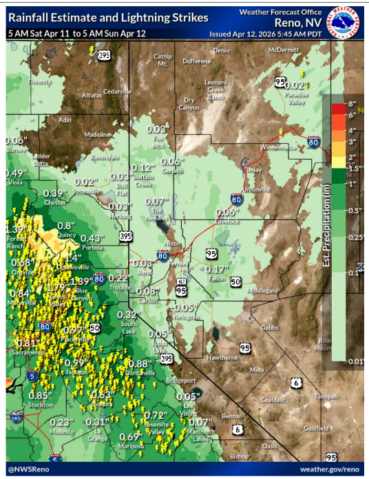 Discuss rain storms in the Sierras. Here's an NWS posting of GOES imagery with lightning detection for especially Saturday and Sunday April 11th and 12th.