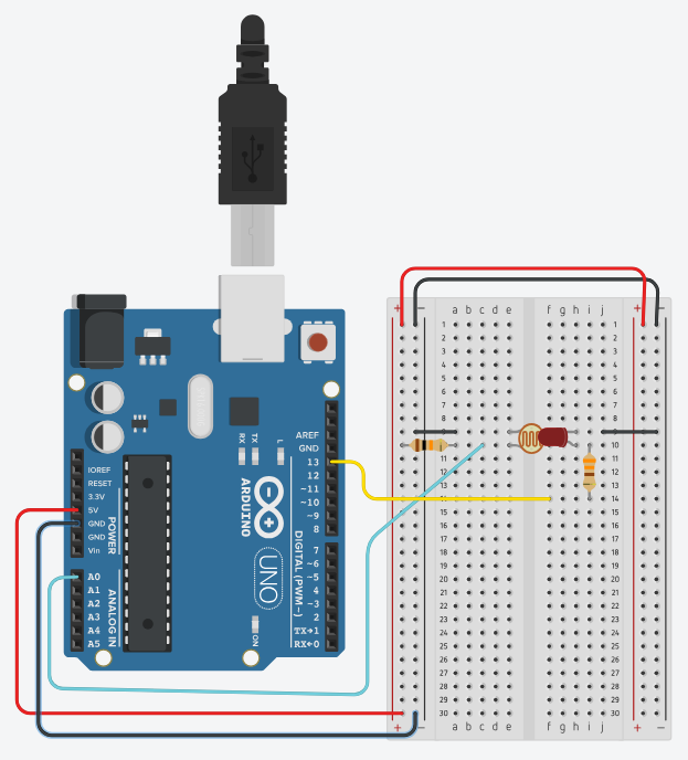 Description of the circuit for the photoresistor test. Click on the image for a larger version. |