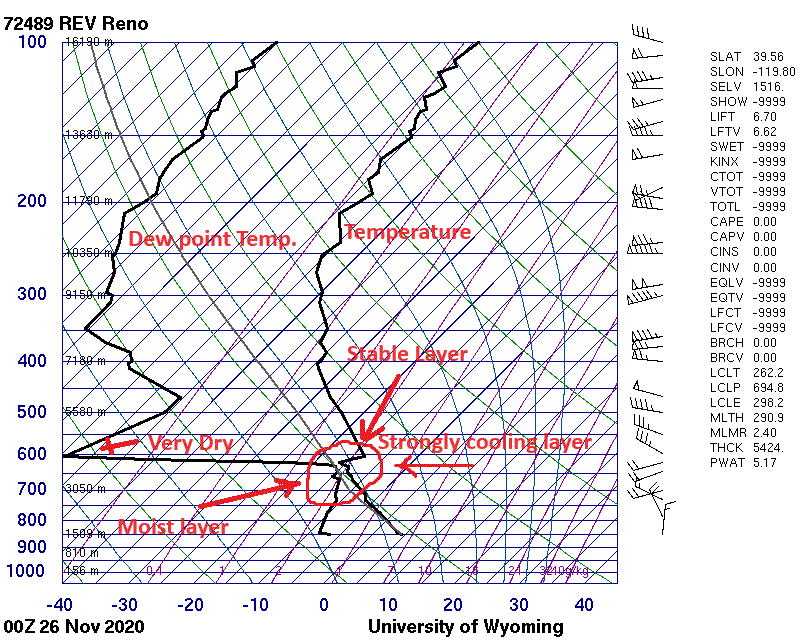 NOTE: The 26 Nov 2020 at 0z sounding is the one relevant for the 25 November 2020 MODIS image for the example wavecloud in Topic 2. This sounding is in the afternoon, approximately 4.5 hours after the satellite image. Here's an example of a marked up skewT-logP sounding with details to also label parts of the diagram. Clouds are likely to form when the dewpoint temperature is very close to the air temperature. Circle the likely layer, probably in the range 500-700 mb level, that is associated with the wavecloud, if there is one.