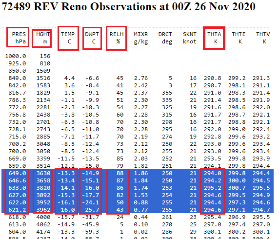 Topic 5: Screen shot of the atmospheric sounding data that highlights the data near where the likely level of the wavecloud is located (here's how to get it). (Here's where to get data: Standard resolution radiosonde data: High resolution radiosonde data).