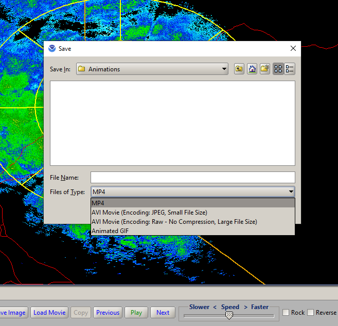 12. Click on the "Animate" button. This will open an anmiation window. Click on the green "Play" button and confirm that you have storm related radar data and not just ground clutter. The dBZ values should be in the green or higher color bars (> 20 dBZ).