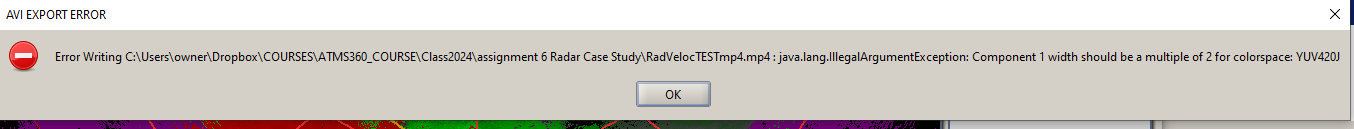 14a. If you get the mp4 error, then choose either the file type "AVI Movie (Encoding:JPEG, Small File Size)" if your movie will be for more than a data extending over 2 hours, or choose "AVI Movie (Encoding Raw - No Compression, Large File Size)" for data extending over less than 2 hours. These AVI files may not be viewable by windows media player, but can be read into powerpoint using this tab and sequence "Insert:VideoThis Device ..", and powerpoint will probably need to format the video. Alternatively, you could use a AVI-mp4 converter like this to get an mp4 video format movie that should be readable by powerpoint.