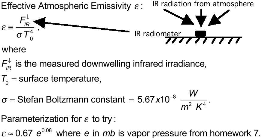 B. Next construct a graph of the effective emissivity on the y axis against the water vapor pressure, e, in mb, on the x axis. We have calculated e in previous homework assignments. On clear days, people tend to think that the effective emissivity is linearly related to the water vapor pressure as follows. Check out this hypothesis. See HW6.1 presentation for water vapor pressure definition, and HW7.1 presentation that gives the calculational tools for it.