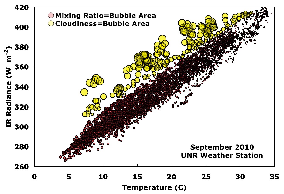 Here is a quick look at the variation of surface downwelling IR with temperature. Data with clouds is highlighted in yellow, and clear sky data with red. Yellow bubble area corresponds to cloudiness, and red bubble area to mixing ratio. The largest IR (vertical axis) occurs at the time of the greatest cloudiness for a given surface temperature (horizontal axis). The mixing ratio is greatest at lowest temperature (red bubble areas are largest then). The red and blue bubbles are mostly transparent so that darkness signifies a higher density of points. Note that cloudiness is low at air temperatures between 20 and 23 degrees C, and that the most anomalously low IR occurs in this temperature interval as well.