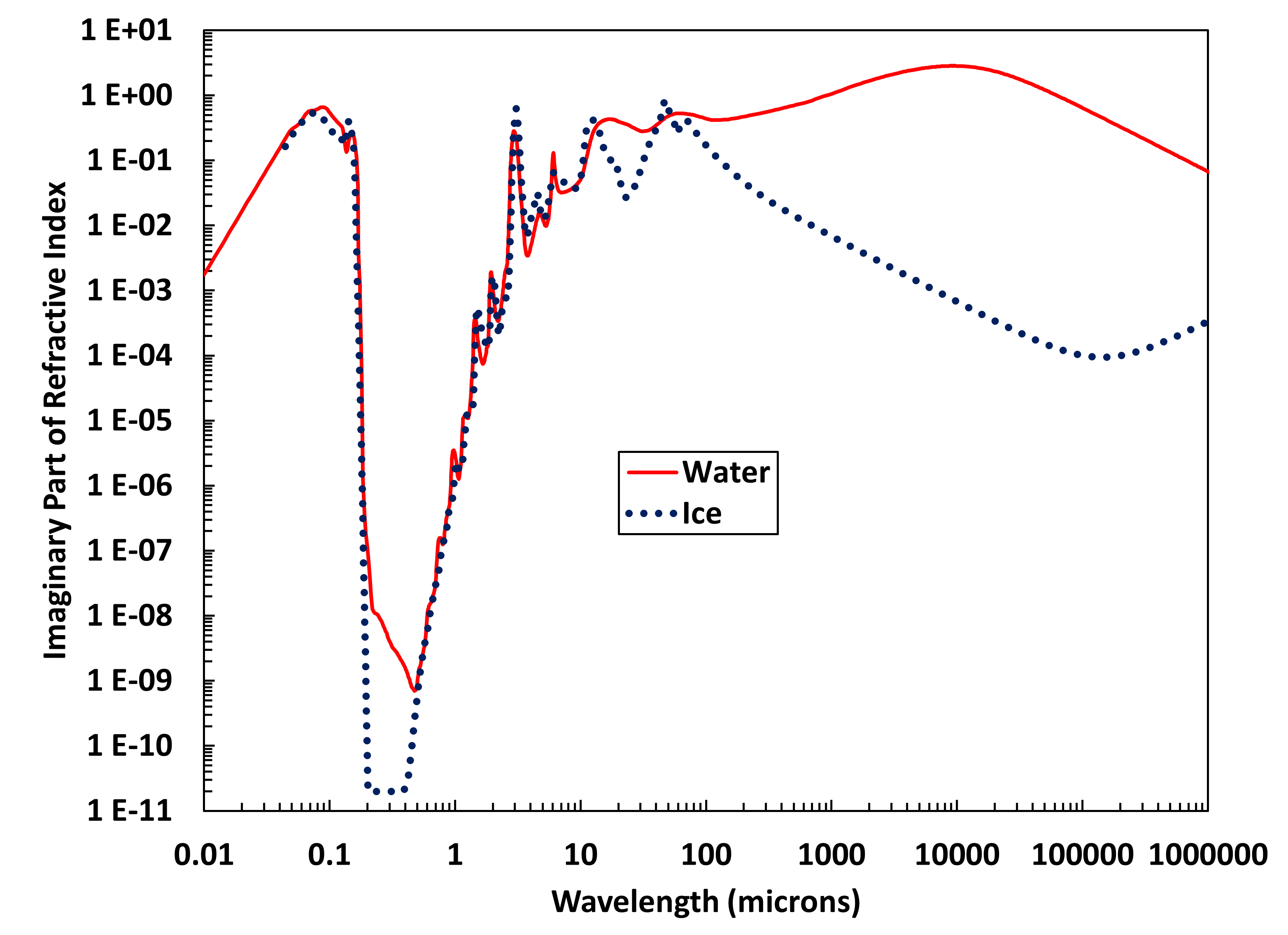 Real and Imaginary parts of refractive index for water and ice as a function of wavelength (spreadsheet containing values).