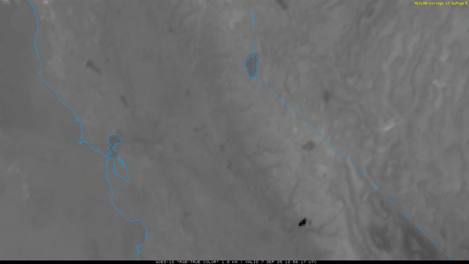 Fire breaks out (GOES imagery) suddenly on the west side of the Sierra Nevada Mountains. Pyrocumulus and lee wave clouds can be seen.