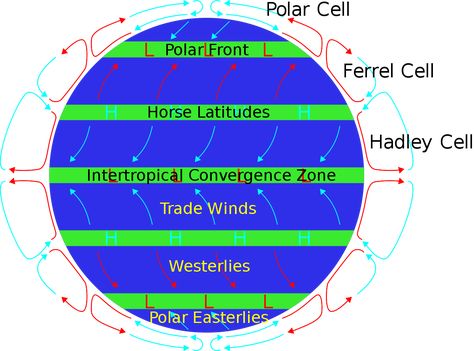 Image showing the idealized average global circulation (source).