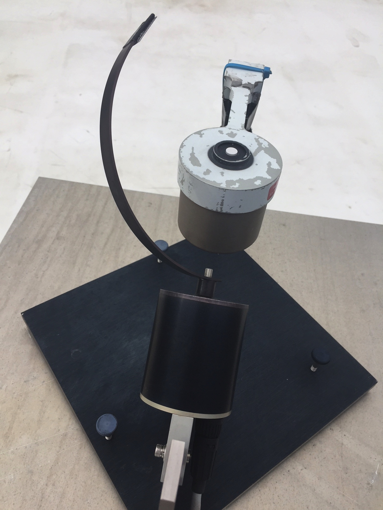 MFRSR with shadow band in place to block direct radiation from the sun for a moment. The shadow band rotate around in 15 seconds. The sensor head is the small white disk in the center. The casing may need a paint job soon. The photodiodes with filters are in the casing below the sensor head.