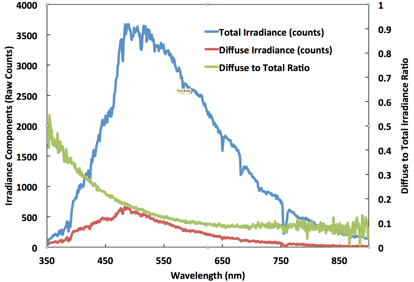 Total and Diffuse Radiation Spreadsheet and graph (raw counts, not calibrated).