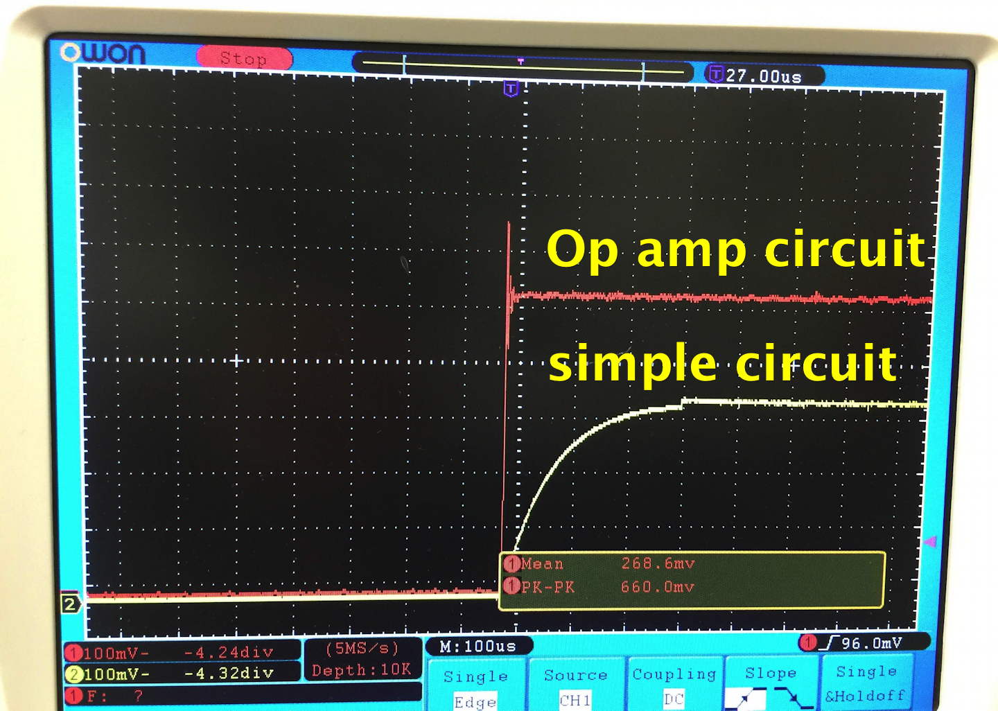 Here are the measurements we made Monday 29 Feb 2016 on the temporal response of the simple and op amp circuit