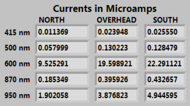 Noted that the value of the 600 nm feedback resistor in the Labview code, for south and overhead, was too large by a factor of 10; changed it at around 6:15 pm.Software Update: