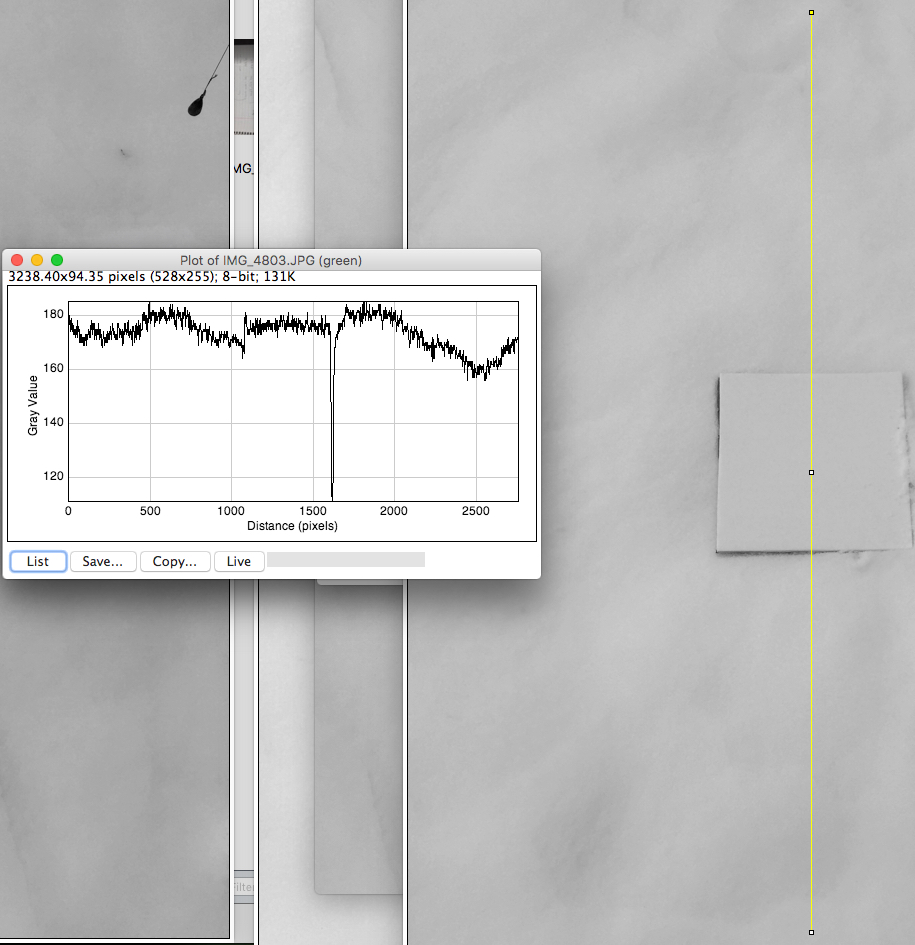 Slice through the red component of the image (see thin vertical yellow line) obtained with ImageJ. Teflon pixels are between 1000 and 1500. Note that some of the snow pixels have greater or lesser reflectivity compared with the teflon.