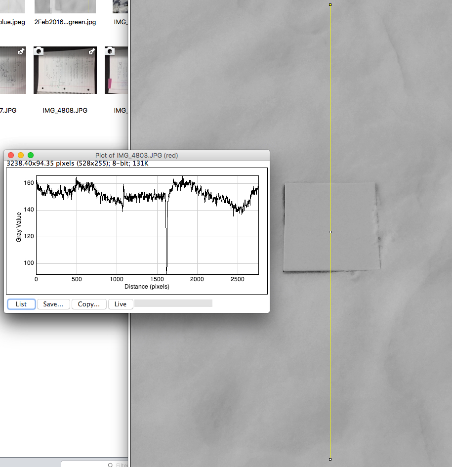 Slice through the green component of the image (see thin vertical yellow line) obtained with ImageJ. Teflon pixels are between 1000 and 1500. Note that some of the snow pixels have greater or lesser reflectivity compared with the teflon.