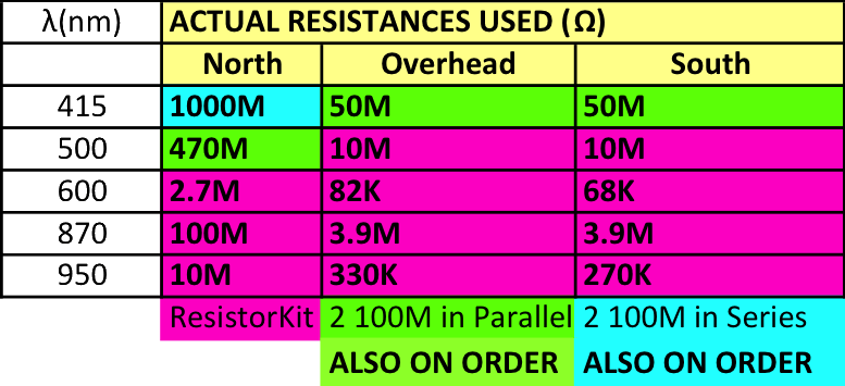 The north facing feedback resistors were changed to get more voltage for the ADC: 415nm->1Gohm 500nm->470Mohm 600nm->2.7M 870nm->100M 950nm->10M.