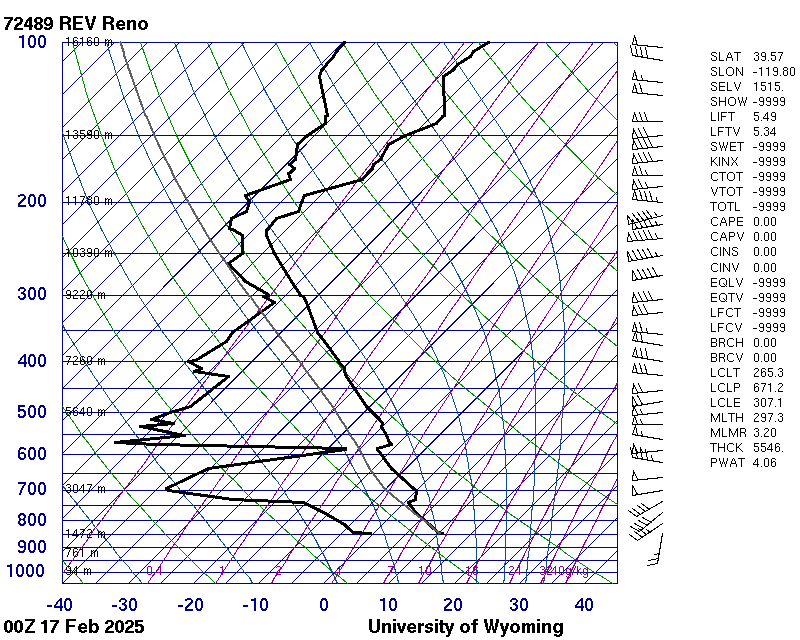 500 mb height and anomaly.Lenticular and rotor clouds observed between Reno and Carson City on the 16th (Sunday). Sounding. Schematic. Model winds at various levels.