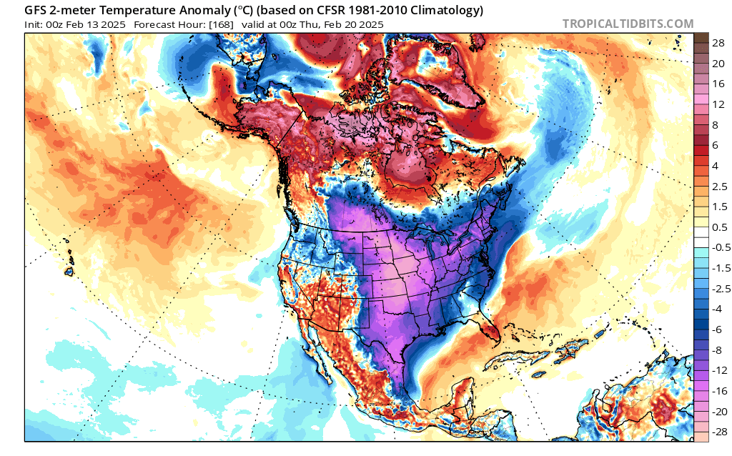 Cold air outbreak in the midwest. Temperature anomaly. (example: Run Time: 18Z Jan 19; valid at 18Z Sun, Jan 19 2025).