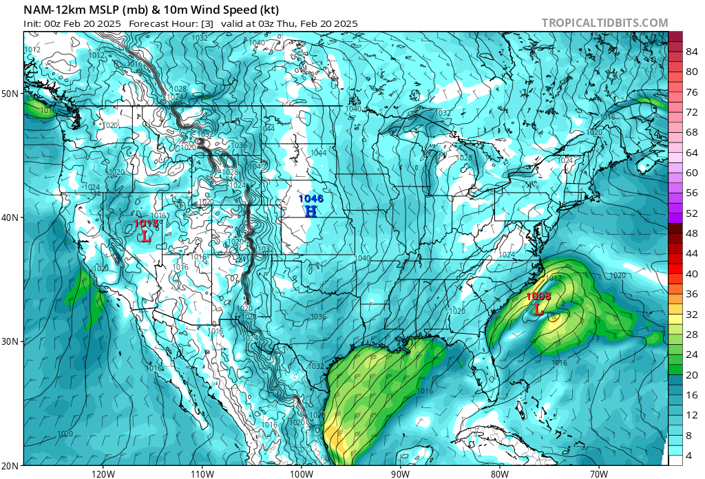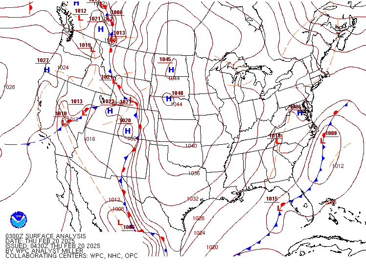 Mean sea level pressure and winds forecast for 202502200200 and surface fronts. 2 meter temperature anomaly for North America.