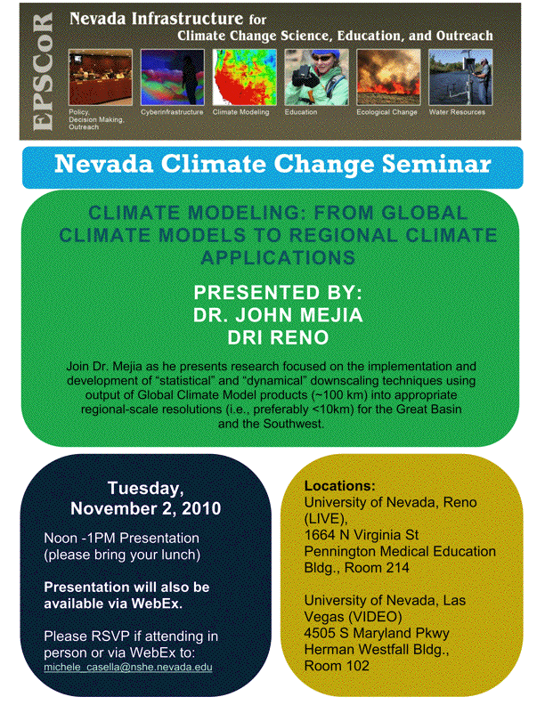 Climate modeling seminar announcement. Tuesday at noon in the Orvil School of Nursing.