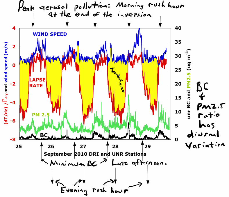 Current 250 mb winds and IR image.Time series of UNR temperature, radiation, and lapse rate ; lapse rate, wind, and particle air pollution September 25 - 29.