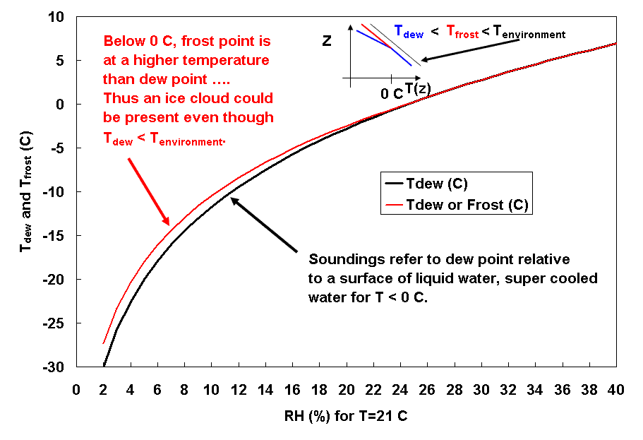 Major knowledge issue with soundings: frost point versus dew point temperature for T < 0 C.