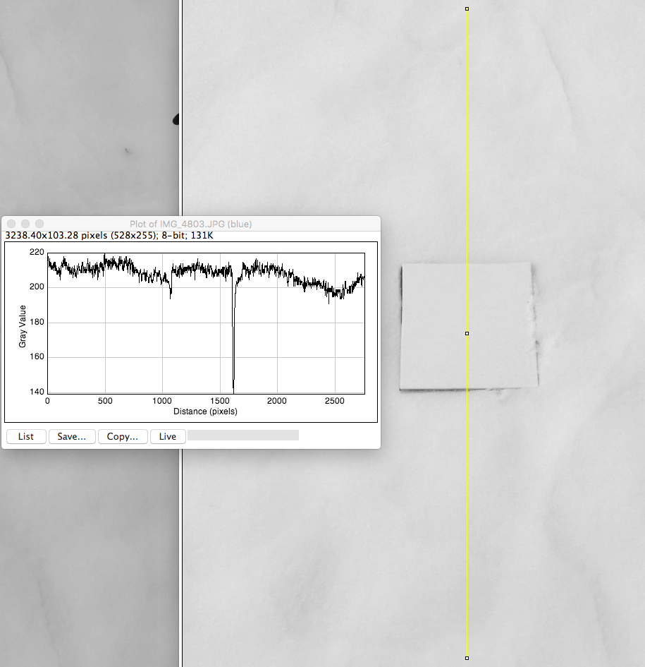 Slice through the blue component of the image (see thin vertical yellow line) obtained with ImageJ. Teflon pixels are between 1000 and 1500. Note that some of the snow pixels have greater or lesser reflectivity compared with the teflon.