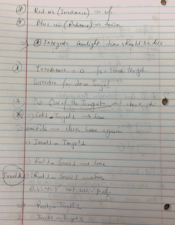It would be good to organize a strategy and people to work with and help Marco to get a comparison of the spectral total irradiance from the MFRSR with the corresponding wavelengths from the new sensor's overhead measurements. Create a time series of both to see how they look first by eye. Then it would be good to plot the MFRSR spectral diffuse radiation compared with the corresponding new sensor's north facing measurements.