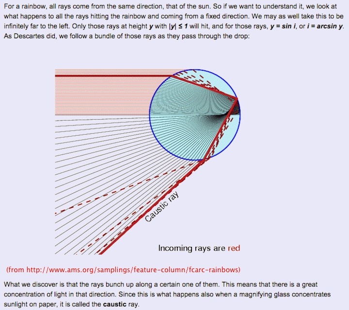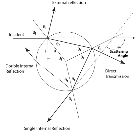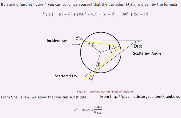 4. Derive an expression for the rainbow angle of a spherical particle as a function of the refractive index (assumed real only). You can do this by solving the condition db/dTheta = 0 (see figures 4.7 and 4.8.) Here b is the impact parameter equal to the sphere radius * sin(thetai). Use your solution to discuss features of the rainbow including for water (rain drops or cloud droplets) why we see color, and why the rainbow is bright. What condition on the refractive index must happen so that the rainbow angle is associated with exact backscattering (this represents the merging of the glory and the rainbow)? Hint: This link is useful. You are looking for a relationship between the scattering angle and the refractive index for the rainbow ray on the cover of the text book.