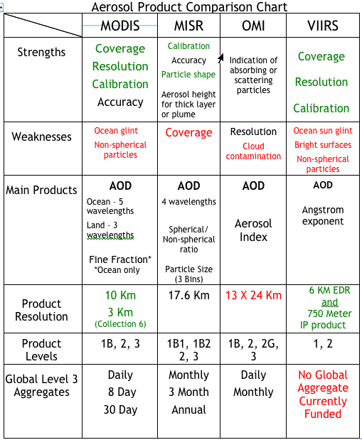 The MODIS instruments are on the AQUA and TERRA satellites in the NASA A-train. Example MODIS raw imagery: Reno and surrounding area. Exercise: find the MODIS true color image for your birthday in 2012; left half of room MODIS from the Terra satellite, right half from the MODIS instrument on the Aqua satellite. Notice and record the time of the image by looking at the 'metadata' file. We will informally discuss these in class. Aerosol Terms Reference Sheet Paper on the MODIS Aerosol Retrieval Algorithm (read). GIOVANNI Beginning Exploration Exercise GIOVANNI Burning Man Evaluation Exercise HDF Exercise 1 Laadsweb Exercise Aerosol Instrument and Product Comparison Chart MODIS aerosol products are evaluated using ground based remote sensing (AERONET). |